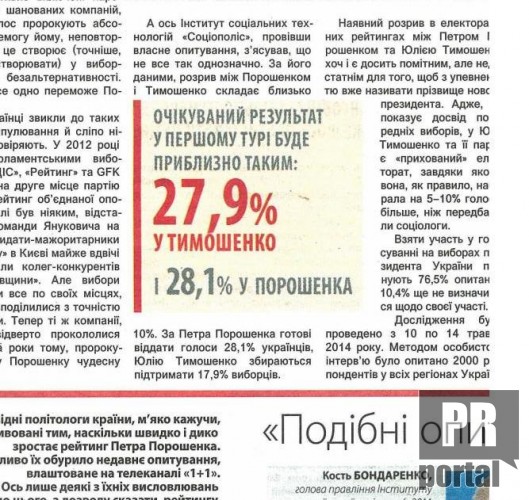 "Велике соціологічне шахрайство" хотіло очорнити відомі соцілогічні інститути - центр. ім. Разумкова, Рейтинг, "Социс" та КМІС (а разом із ними кандидата в Президенти Петра Порошенка) намалювавши Юліі Тимошенко рейтинг майже 28%. Поруч із невідомо звідки взятими, проте великими літерами надрукованими, цифрами (це часом не порушення Закону?) видання "Вечірні вісті" приводить навіть коментарі відомих політологів та експертів.