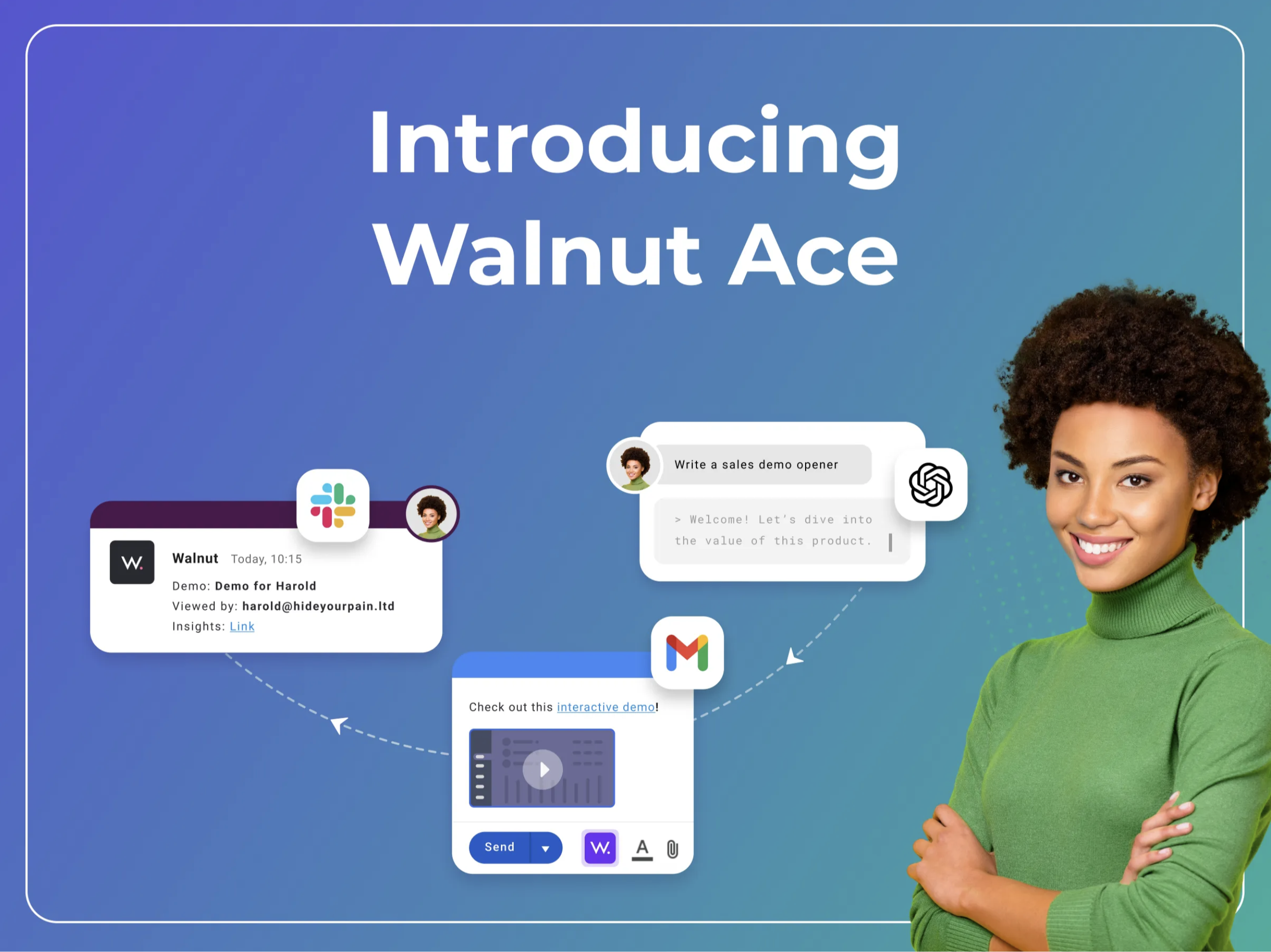 Walnut Ace дає перевагу командам продажів, поєднуючи OpenAI, Slack і Gmail, щоб швидко рухатися, ефективно відповідати та надавати переконливі демонстрації продуктів.