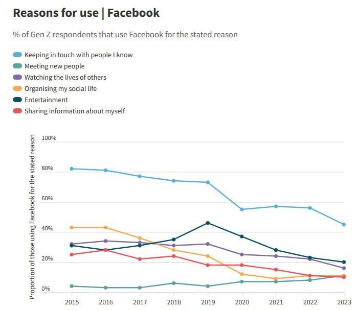 Дослідження показують, що покоління Z використовує Facebook для підтримки зв'язків з уже знайомими людьми, тоді як молодь шукає розваги на інших платформах, таких як Instagram, YouTube, та TikTok. Ця тенденція свідчить про зміну динаміки у використанні соцмереж, зсуваючи акцент з соціальної взаємодії на медійний контент.