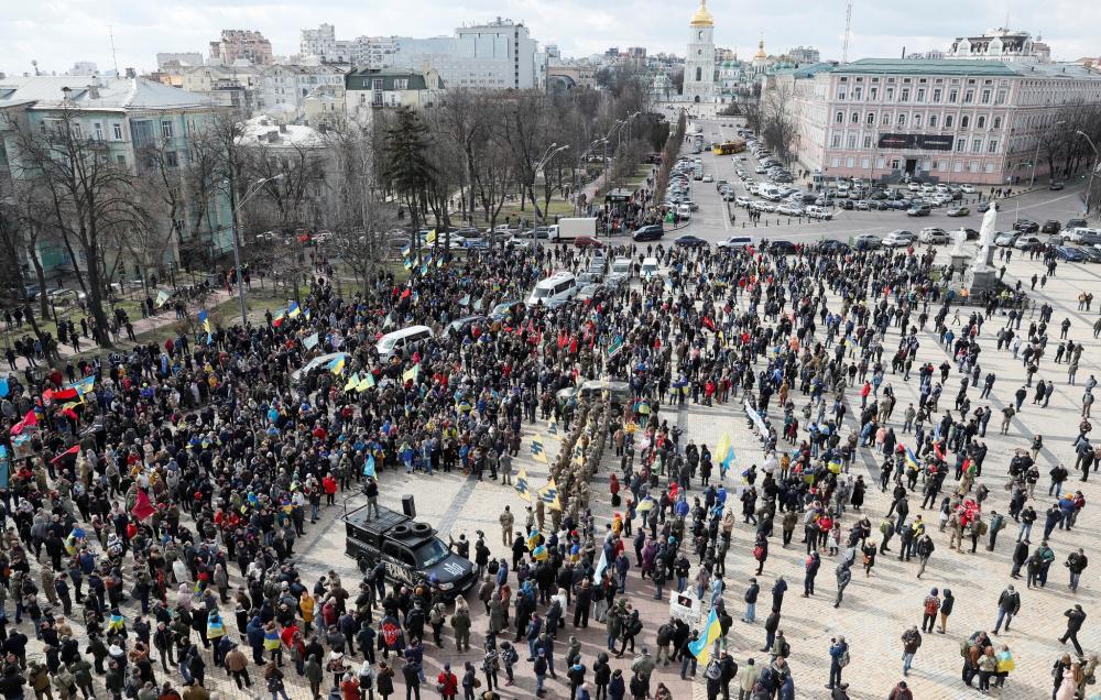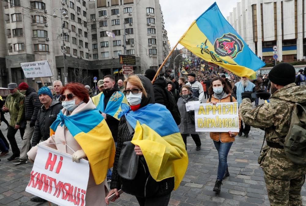Несколько тысяч человек вышли в центр Киева на субботний протест против того, что они воспринимают как уступку России в переговорах о прекращении боевых действий на Донбассе.