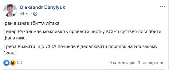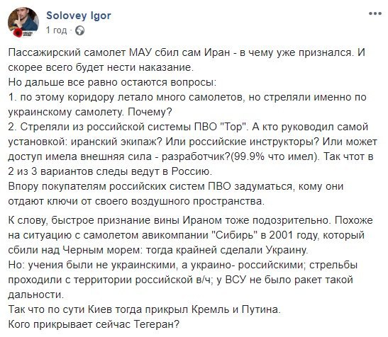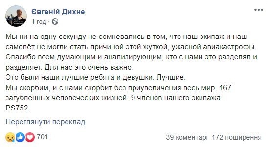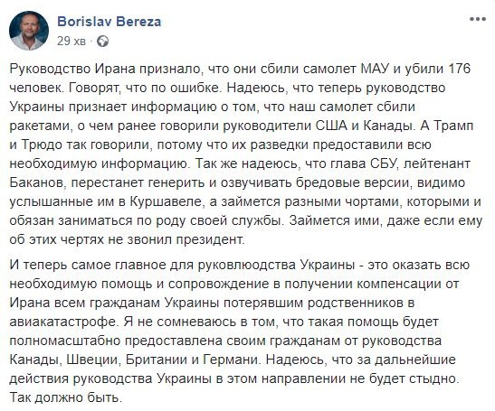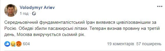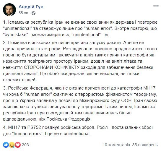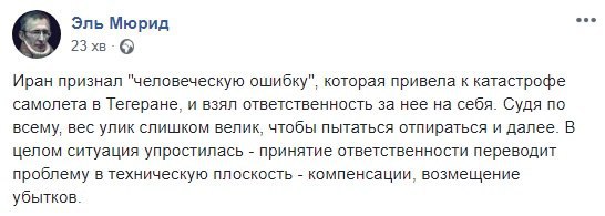 Відзначимо, в офіційній заяві іранської сторони йдеться, що трагедія сталася через "людський фактор", а винних обіцяють притягнути до відповідальності. Там також підтвердили, що літак помилково прийняли за ворожий об'єкт після того, як він повернув у бік військового центру Корпусу вартових Ісламської революції.