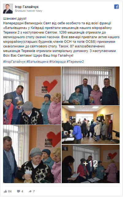 Щоправда, пощастило лише мешканцям столичного мікрорайону Теремки-2, за яким Галайчук пройшов до Київради. У своєму дописі на Фейсбуці депутат повідомив: привітали актив району, а 87 малозабезпечених мешканців мікрорайону отримали матеріальну допомогу.