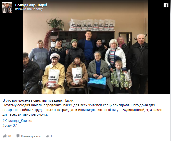У номінацію до благодійників потрапив і депутат Київради Володимир Шарій. Він зі своєю командою відвіз паски до спеціалізованого житлового будинку для людей похилого віку. Благодійність подали спільноті як слід: мінімум слів плюс світлина зі щасливими та усміхненими пенсіонерами, у руках яких – пакунки з іменем добродія.
