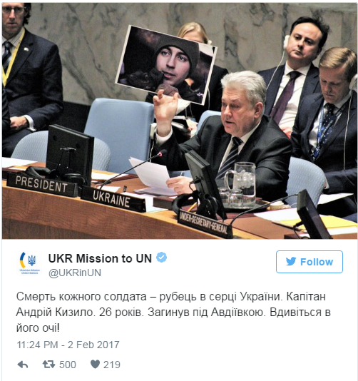 Набагато цікавішими були промови представників України, Франції, Великої Британії, США тощо. Постійний представник України при ООН Володимир Єльченко під час доповіді демонстрував два фото. На одному було зображено багатоквартирний будинок в Авдіївці, зруйнований обстрілами. Друге фото, на якому був зображений загиблий український військовий Андрій Кизило, він показав постпреду РФ в ООН Віталію Чуркіну: "Подивіться в його очі, ви його вбили!"