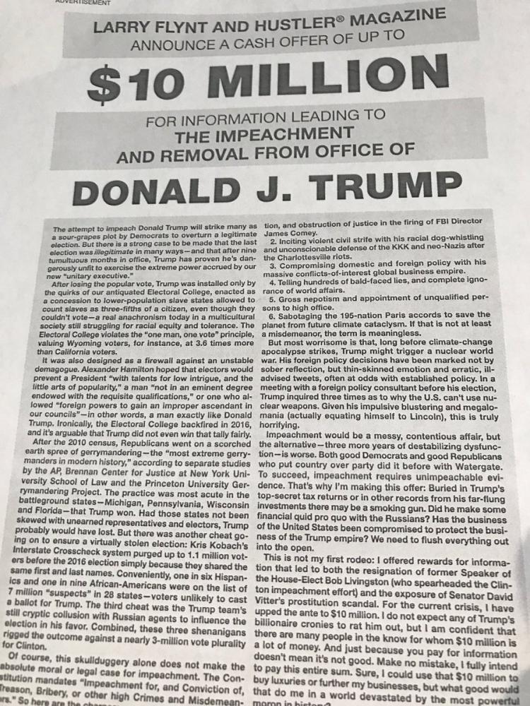 Основатель журнала Hustler Ларри Флинт, дал полностраничное объявление в воскресном выпуске The Washington Post о вознаграждении в $10 млн за информацию, которая может привести к импичменту президента Дональда Трампа.