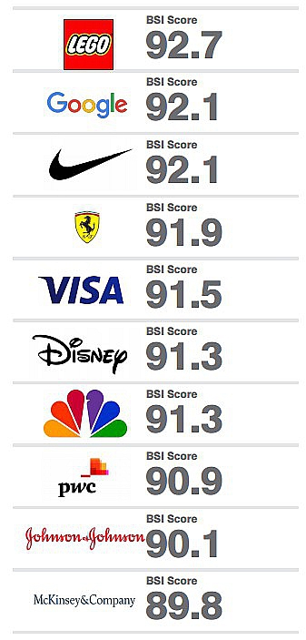 Перемены коснулись и рейтинга самых влиятельных брендов мира. В этом году Lego уверено занял первое место, отбросив Disney, прошлогоднего лидера, на шестое место. Google, Nike, Ferrari и Visa заняли со 2 по 4 позицию соответственно. Аналитики компании связывают успех бренда Lego с его продуманной стратегией. На популярность Lego оказал немалое влияние фильм Lego Movie, выпущенный в 2014 году.
