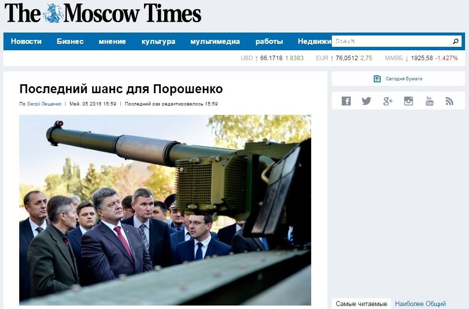 Сергей Лещенко написал статью для The Moscow Times - еженедельника на английском языке, выпускаемый в Москве. Статья называется "Последний шанс для Порошенко".
