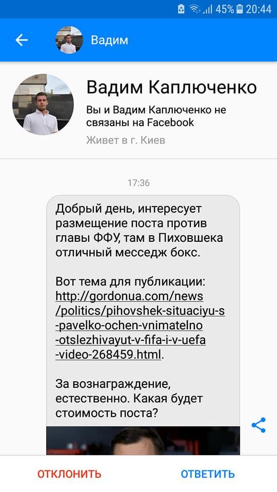 І як вам це подобається? Живу собі, пописую на ФБ, аж раптом бачу серед приватних повідомлень ЦЕ. От саме те, що ви бачите на фотах. Якийсь невідомий мені Вадим Каплюченко пропонує розмістити заказуху проти голови Федерації футболу України Андрія Павелка. За гроші, звісно. Знаєте, футбол – не моя тема, я в ньому – ані бум-бум. За інших умов я може й просто не звернув би увагу на цей мессидж (знали б ви, що мені подекуди читати в приваті доводиться). Але…