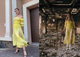 Українська блогерка dianagloster нещодавно опублікувала колаж із фото на фоні зруйнованого будинку культури в Ірпіні у яскравій сукні жовтого кольору від українського бренду Mon Blanche.