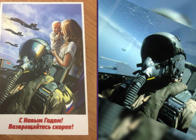 Російські пропагандисти знову оконфузилися: створили листівку, на якій жінка з дитиною просить пілота американського винищувача повертатися додому.