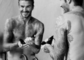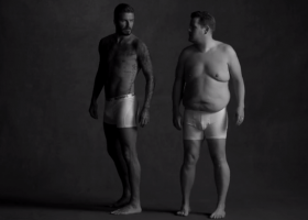 Джеймс Корден контрастировал на фоне бывшего футболиста, которые предстали перед камерой в одних трусах.