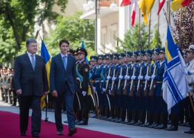 Премьер-министр Канады Джастин Трюдо во время церемонии встречи возле администрации Президента Украины поприветствовал почетный караул на украинском языке.