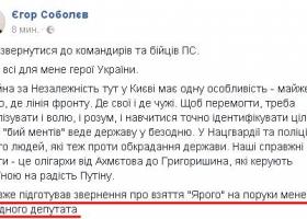 Народный депутат от «Самопомощи» Егор Соболев был избит в центре Киева 19 февраля, когда у Администрации Президента активисты устраивали пикет в поддержку блокады Донбасса.