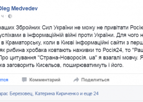Спічрайтер та позаштатний радник Президента Петра Порошенка Олег Медведєв у День Збройних сил України розмістив гнівний пост. Він привітав Росію з успіхами в інформаційній війні досягнуті завдяки українським медіа