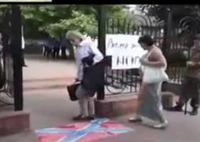 В Одесі пройшла акція, в ході якої активісти розстелили прапор "Новоросії" біля входу до Апеляційного суду і запропонували витирати об нього ноги