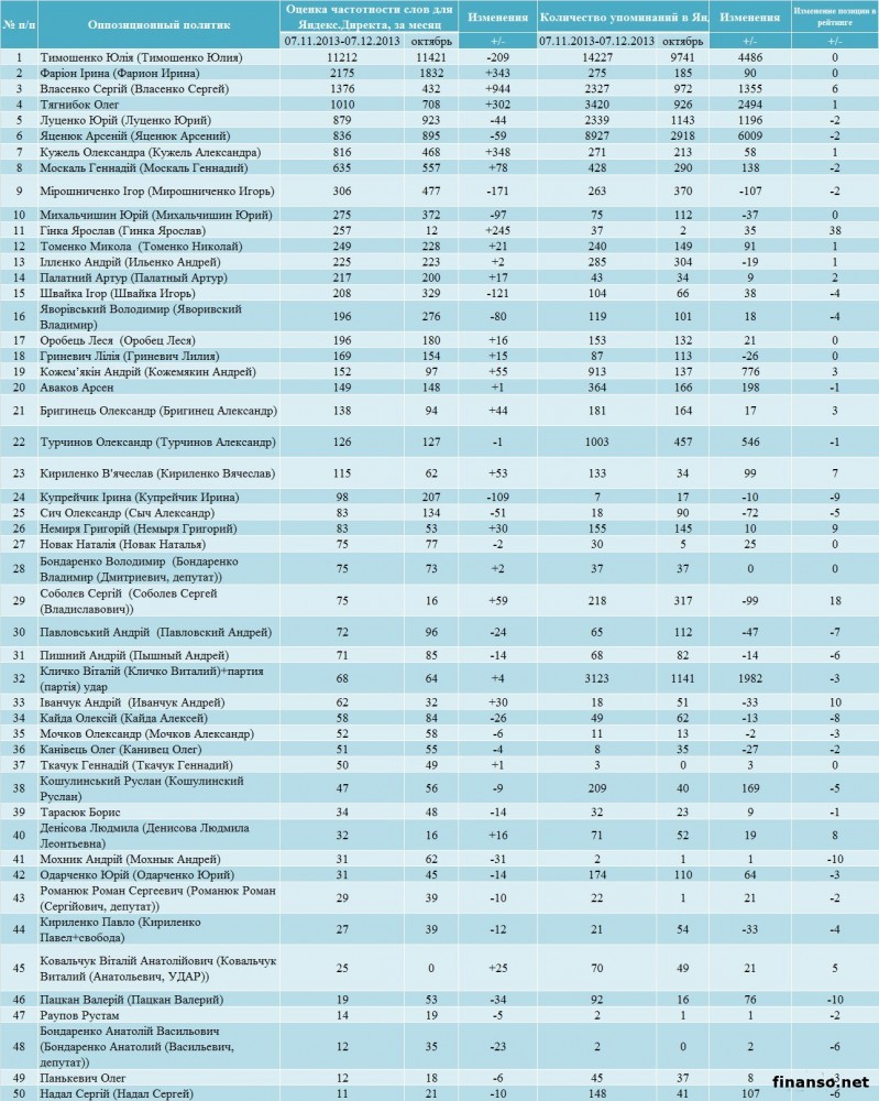 Первую позицию рейтинга журнала для инвесторов "Украина сегодня: finanso.net" досталось Юлии Тимошенко (11212 запросов украинцев в Яндексе за период с 7 ноября по 7 декабря 2013 года). Новостными поводами о Юлии Тимошенко стали портрет экс-премьера, вывешенный на центральной елке столицы; требование депутата Европарламента об освобождении осужденной Ю. Тимошенко; прекращение 11-дневной голодовки Юлией Тимошенко и другие.