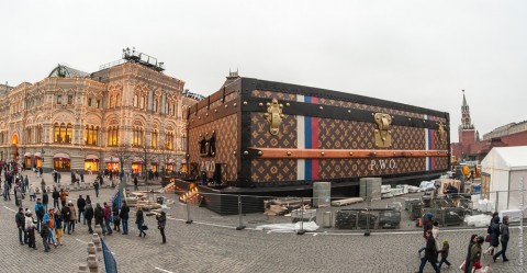 В Москве установили огромную конструкцию, по всей видимости, изображающую сумку Louis Vuitton. Этот чемодан установлен в рамках подготовка к выставке дома моды Луи Виттон. Сумка будет находиться на Красной площади всё время, что идёт выставка: с 4 декабря по 19 января.
