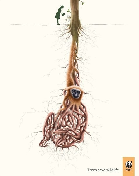 На не менее интересных принтах от Всемирного фонда защиты диких животных, звери "прячутся" в корнях деревьев. "Деревья сохраняют жизнь диких животных", - сообщает социалка.
