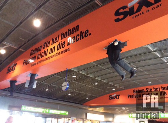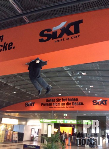 Компанія, яка здає в оренду авто, в оригінальний спосіб продемонструвала свої низькі ціни. В Дортмунді показали клієтів, що застряли на стелі. Слоган говорить, що люди йдуть до них і стрибають від радості аж до стелі, бо в них не захмарні ціни.