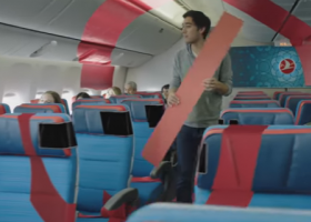 В ролике Кинг превращает ноутбук в лист бумаги, из схемы салона делает самолетик, а его футболка становится спасательным жилетом