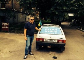 Колишній Президент Грузії Михайло Саакашвілі сфотографувався біля автомобіля з українськім прапорцем і написом на склі: "Крым - Украина. Путин ху**ло, ла-ла-ла-ла-ла...".
