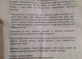 У Києві з'явилися листівки з проханням перерахувати "посильну матеріальну допомогу на рахунок виборчої кампанії" Юрія Левченка. Наприкінці листівки наводяться реквізити ніби-то виборчого фонду опозиційного кандидата по 223 виборчому округу.