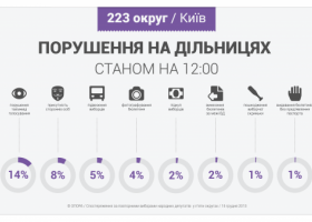 Станом на 13.00 годину найбільше зафіксованих порушень стосується присутності в приміщеннях виборчих дільниць сторонніх осіб та недотримання таємниці голосування.