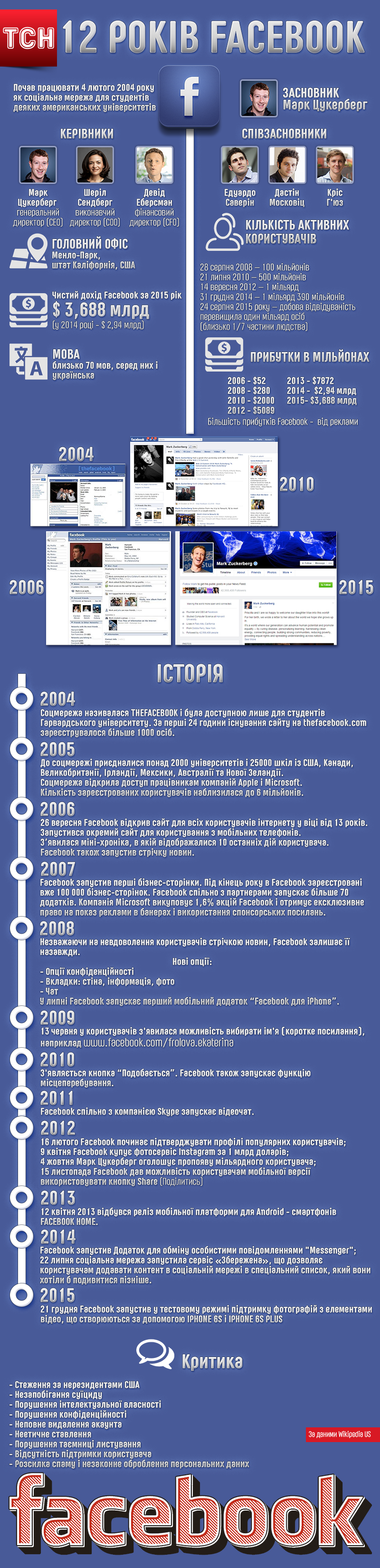За 12 років соцмережа змінювалася та еволюціонувала із закритого сайту для студентів Гарварду до всесвітньої мережі із мільярдом користувачів. Дізнатися коротку історію та цікаві факти про Facebook можна в інфографіці ТСН.ua.
