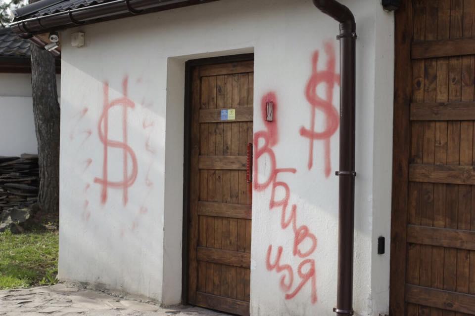 На стінах забору намальований знак долара, свиня з російським прапором, написи Крадійка, Посіпака, Вбивця.