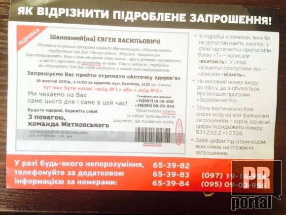 В рамках програми «Здорове місто» від представника БПП мешканцям міста приходили запрошення на отримання аптечки з безкоштовними ліками.