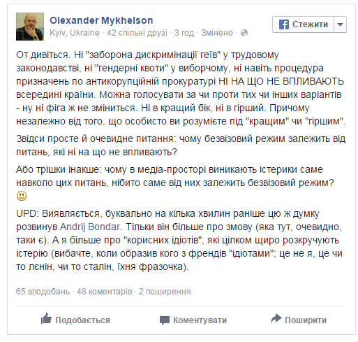 Подчеркнем, что внесение в законодательство противодействия дискриминации по признаку сексуальной ориентации является одним из пунктов Плана действий по визовой либерализации, выполнение которого необходимо для введения безвизового режима между Украиной и ЕС.