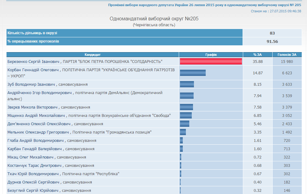 На даний момент лідирує народний депутат від партії "БПП" Сергій Березенко - він набрав 35,88% голосів. Геннадій Корбан від партії "Укроп" набрав 14,87% голосів.