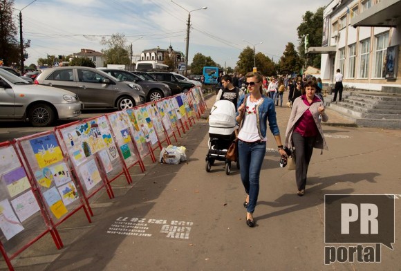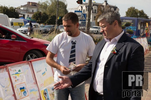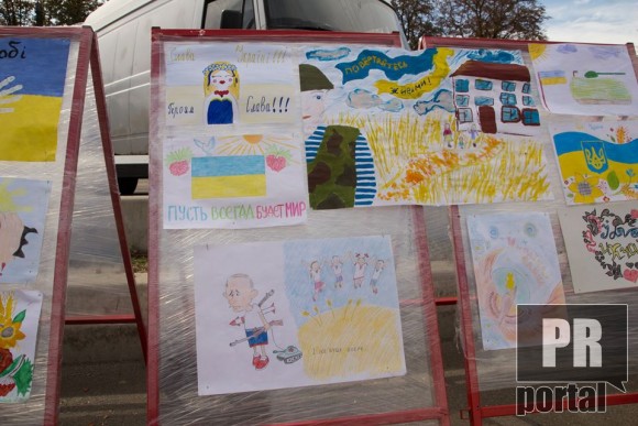 "Знайомий розповів одну історію. Батьки попросили свою доньку намалювати малюнок для українских солдат. Малеча побігла до себе в кімнату і через певний час принесла малюнок на якому було зображено державний прапор. Малюнок, через волонтерів, відправили на Схід. Він потрапив до водія БТРа. Солдат помістив його у файл і повісив у себе в машині. Знайомі розповіли, що ця бронемашина з дитячим малюноком виходила неушкодженою з поля бою. Малюнок став оберегом. Не знаю правда це чи ні, але саме після цієї розовіді з'явилася ідея провести конкурс "Діти - українським воїнам", підсумки якого підвели на день міст Борисполя та Яготина", - написав Сергій Міщенко і зізнався, що "не очікував такої кількості малюнків".