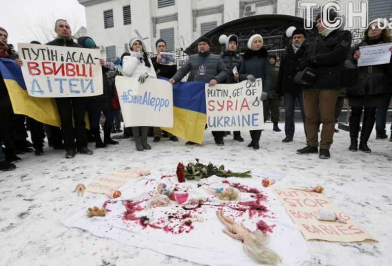 Дитячі фотографії та кров: у Києві під посольством Росії вимагають припинити бомбардування Алеппо