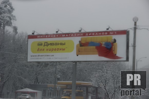 Київський інтернет-магазин, котрий спеціалізується на продажу диванів вирішив заманити клієнтів... суперменом. На біллбордах супергерой відпочиває та, судячи зі слогану, пішов у нірвану, що не характерно супергерою