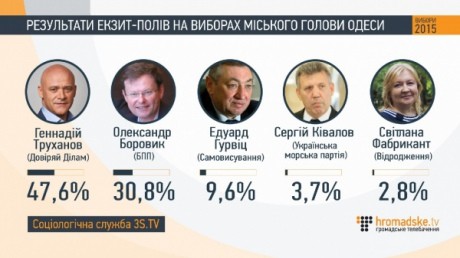 Водночас, Труханов заявив, що за даними їхнього екзит-полу, він набирає 53%, а Саша Боровик отримав 29%. Труханов упевнений, що другого туру виборів мера Одеси не буде, пише Українська правда