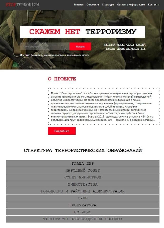З 30 березня група волонтерів запускає сайт "Стоп тероризму", на якому буде опублікована інформація про всіх учасників незаконних військових формувань "ДНР". Про це на своїй сторінці у Facebook написав голова поліції Донеччини В'ячеслав Аброськін.