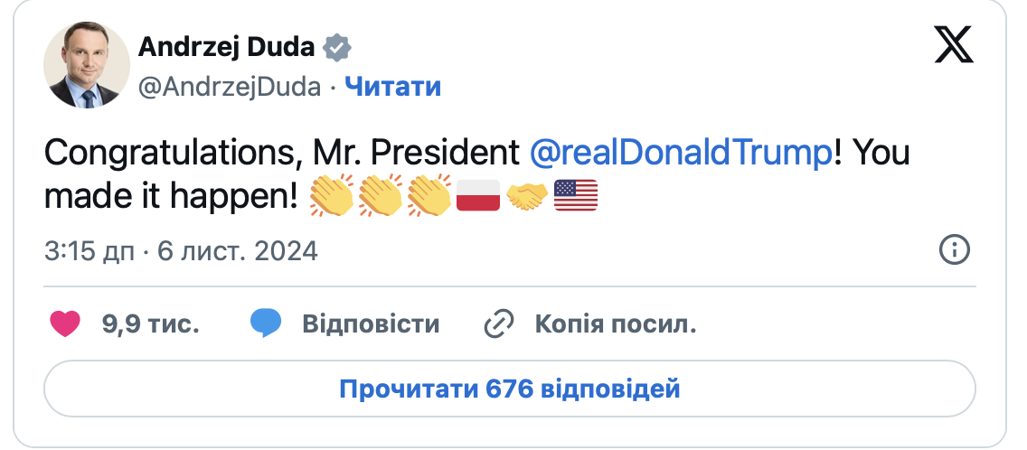 Коротке вітання опублікував і президент Польщі Анджей Дуда.