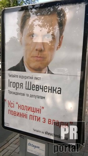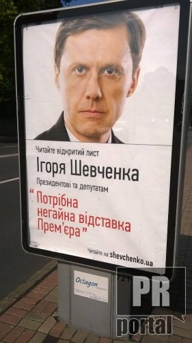 Экс-министр экологии и природных ресурсов Украины Игорь Шевченко, по всей видимости, начал свою предвыборную кампанию.В Киеве появились ситилайты с лозунгами, которые оригинально замаскированы под название открытых писем адресованных к президенту Украины и народным депутатам.