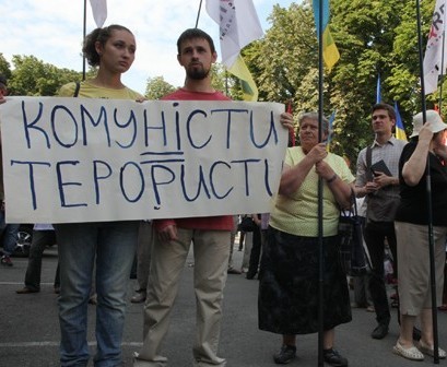 Люди держали плакаты «Комуняку на гілляку» и «Серп і молот - смерть і голод» и требовали от суда запретить деятельность в Украине Коммунистической партии