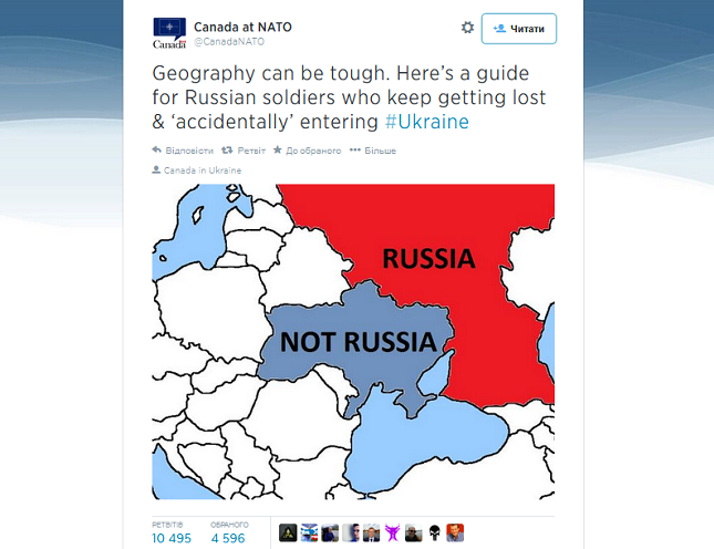 Канадська делегація опублікувалана у своєму твіттер-аккаунті карту, яка б допомогла російським військовим, які «випадково опинилися на території України».