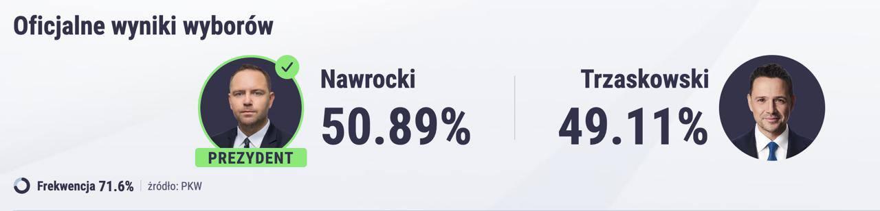 Державна виборча комісія Польщі опрацювала 100% протоколів. За результатами підрахунку голосів Навроцький отримав підтримку 50,89% виборців, Рафал Тшасковський — 49,11%.