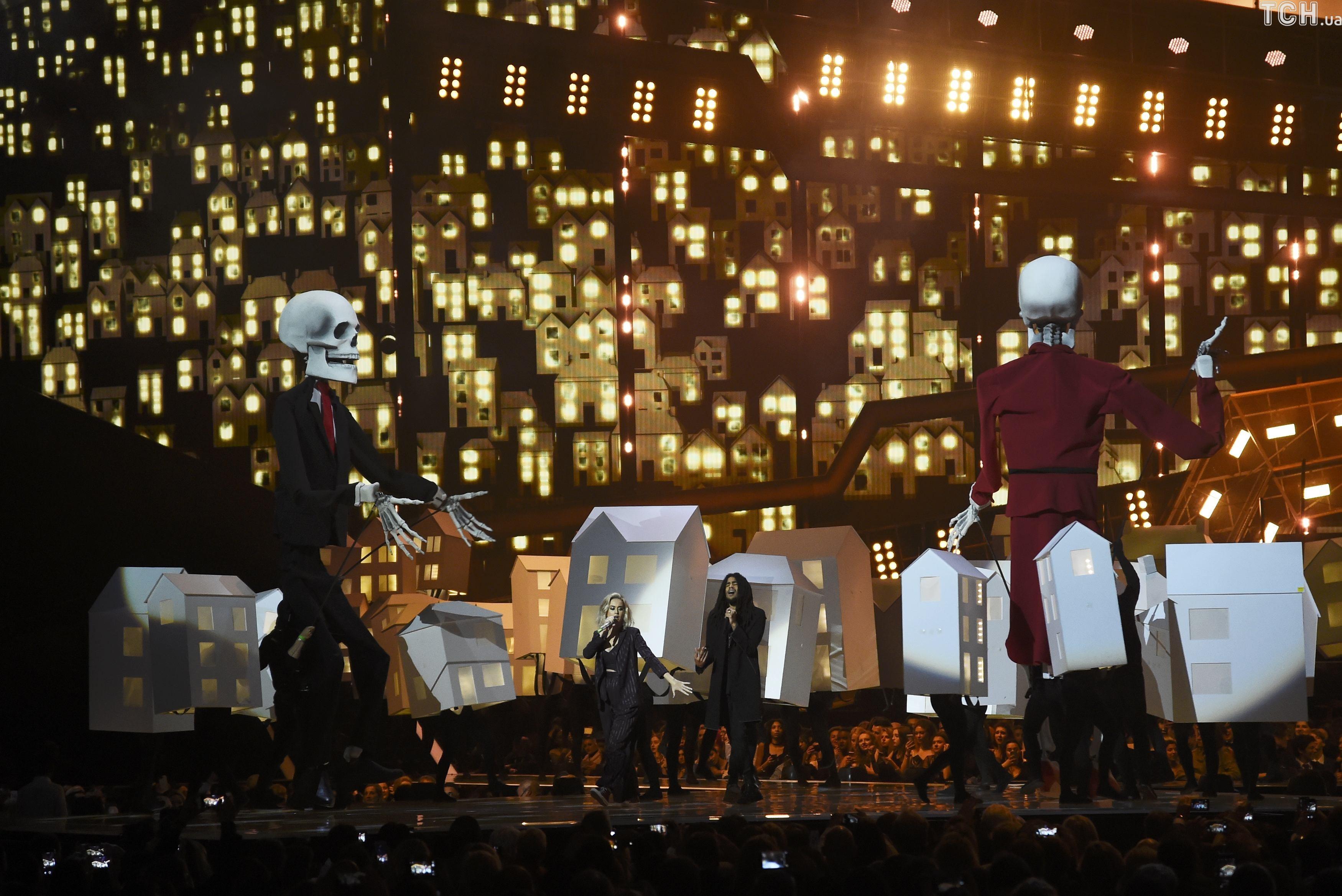 Виступ Кеті Перрі супроводжувало двоє величезних скелети, які імітували Трампа та прем'єр-міністра Великобританії Терезу Мей. Таким чином співачка зробила пародію на нещодавню зустріч політиків у Білому домі.