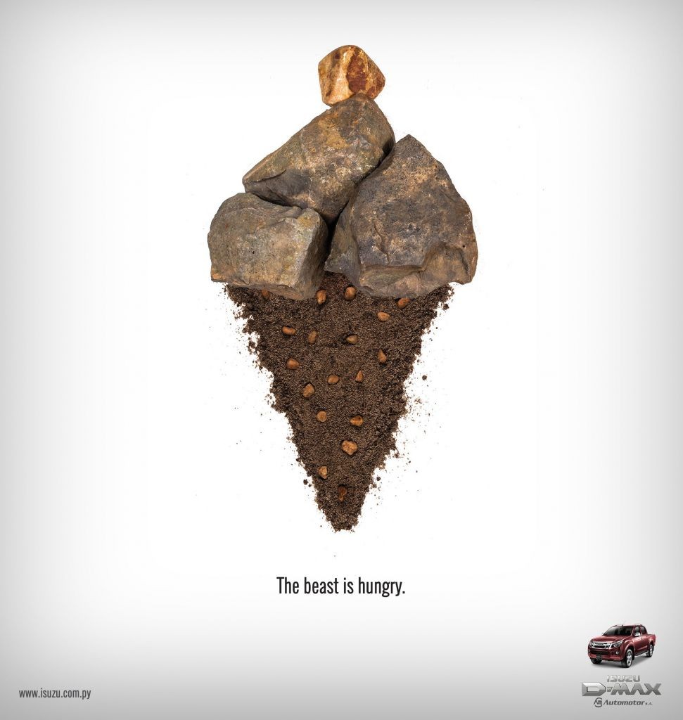 "Зверь голоден!" - Isuzu представила свой внедорожник Isuzu D-Max в виде голодного зверя, который "питается" бездорожьем. Креативные принты агентства Garabato, Парагвай.