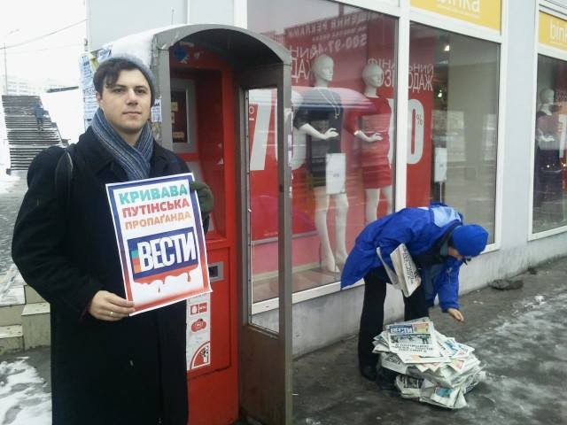 «Друзі, ми маємо пояснити киянам, що читати газету "Вести" ганебно після ось таких публікацій:«Трагедия под. Волновахой требует тщательного и непредвзятого расследования»», - закликають організатори акції.
