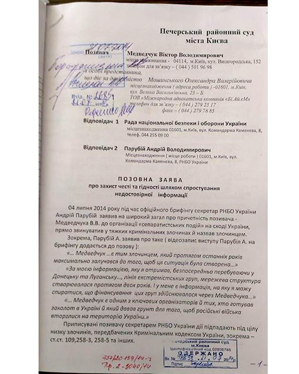 Глава организации «Украинский выбор» Виктор Медведчук подал в суд на секретаря Совета национальной безопасности и обороны Андрея Парубия