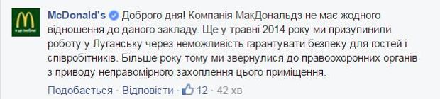 Водночас в офіційному McDonald's запевняють, що до відкриття фейкового закладу вони жодного стосунку не мають, а роботу в окупованому Луганську припинили ще у травні 2014 року.