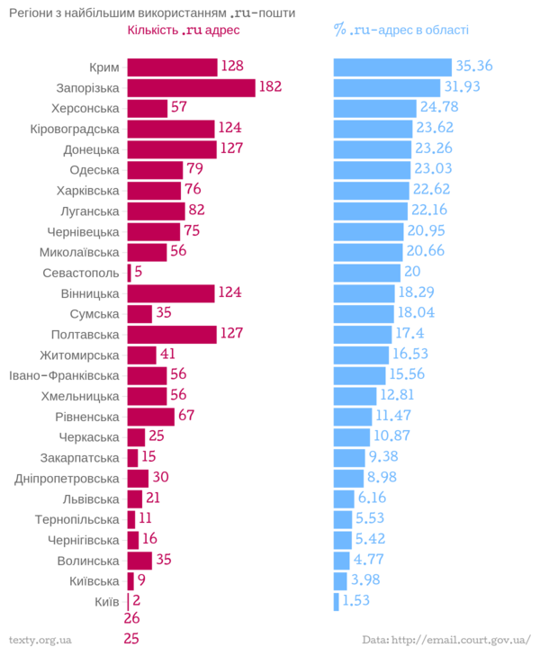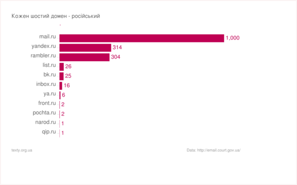 Графіки побудовані на основі нашого аналізу даних з офіційного реєстру електронних адрес українських органів влади, що знаходиться за адресою http://email.court.gov.ua/(близько 10 000 адрес в базі)