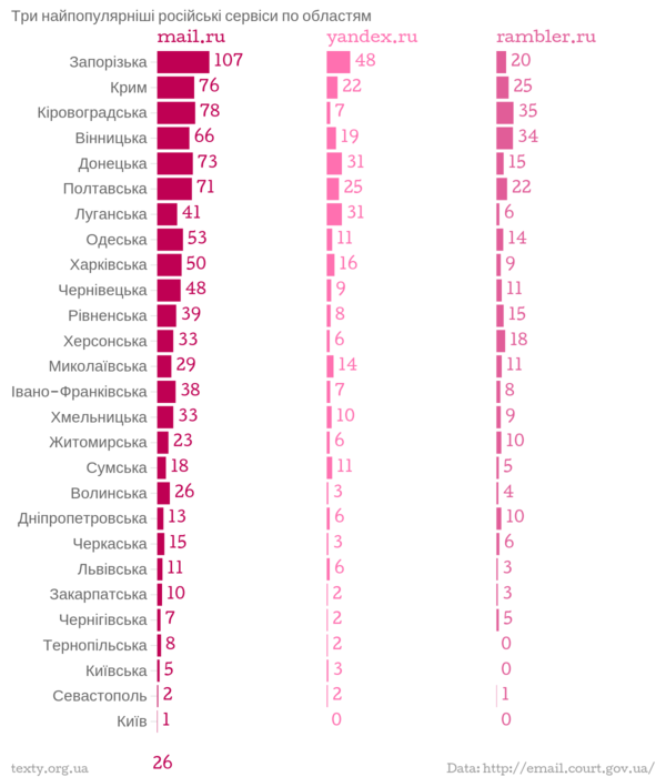 Використання мейл.ру, яндекса та рамблера в областях: