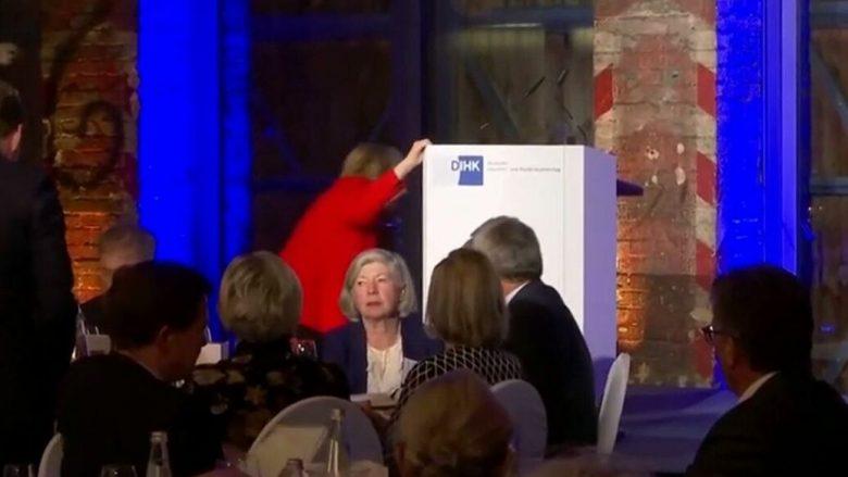На кадрах видно, как Меркель проходит к сцене, а когда начинает подниматься по ней, спотыкается и падает на колени. Канцлер тут же поднялась самостоятельно.
